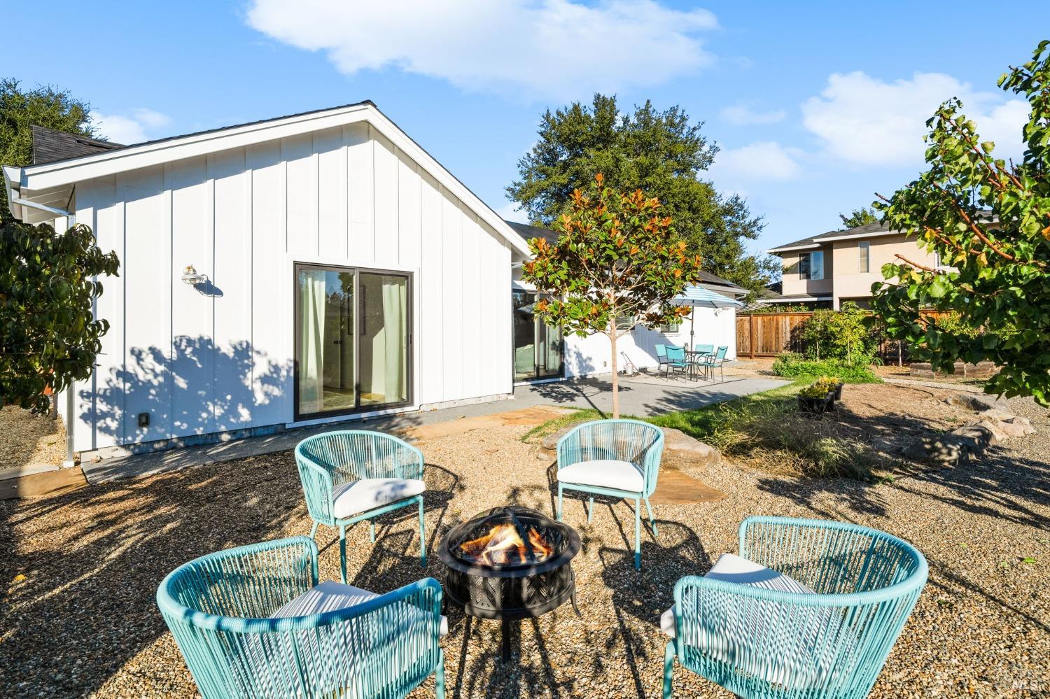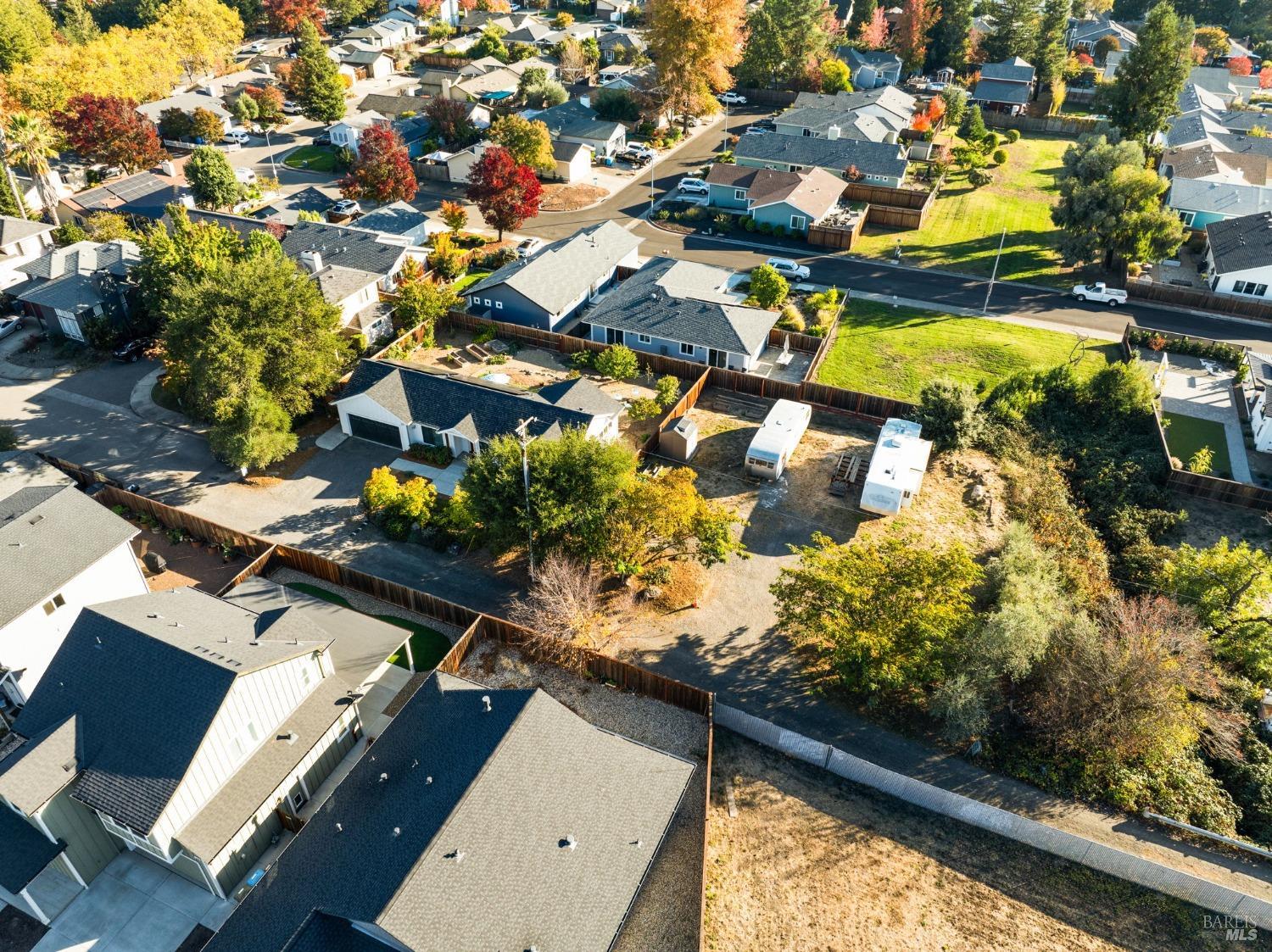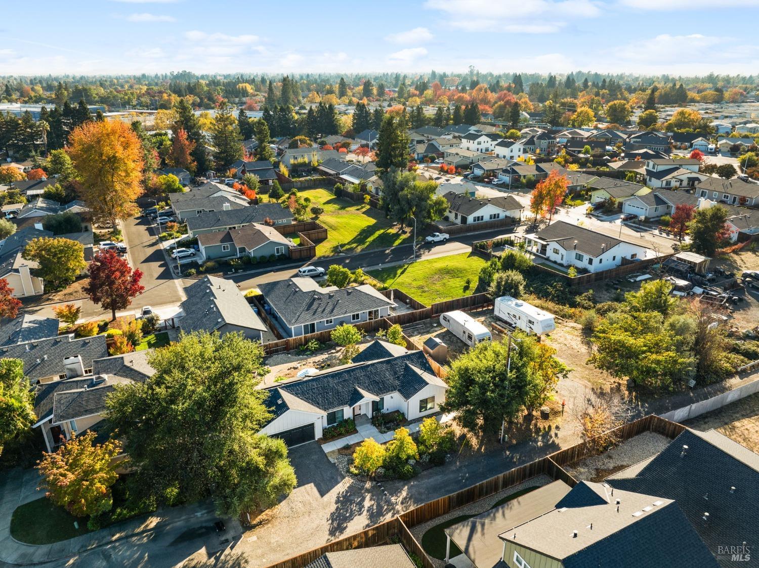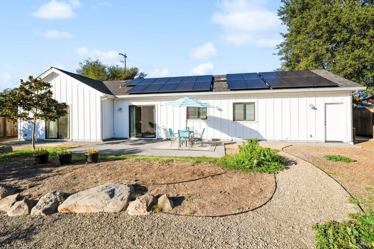 Attention Investors, Builders, and Those Seeking Privacy and Space! This custom-built 2-bedroom home, completed in 2021, is set on over half an acre, offering endless possibilities for expansion to add an ADU, gardens, or a pool. Located on a quiet lane near Coffey Park, it's conveniently close to schools, parks, and shopping, while providing ultimate privacy and views. The open floor plan features 9-foot ceilings, engineered hickory hardwood floors, and a bright, airy atmosphere. The kitchen includes granite countertops, a tiled backsplash, a large island, and soft-close cabinetry. Step outside to a private backyard with a spacious patio, redwood fencing, and mature fruit trees (apple, nectarine, pear, plum, apricot, pomegranate, cherry, and Meyer lemon). Raised garden beds are ready for planting. The primary bedroom has a walk-in closet and direct patio access, while the en-suite bath features custom-tiled flooring and a glass-enclosed shower. The second bedroom is generously sized, and the guest bath includes penny tile flooring and a subway-tiled tub/shower combo. Energy-efficient with central heat & air, all-electric utilities, and paid solar panels and pre-installed car charger in garage for low utility bills. Fridge NOT included, it was virtually added.